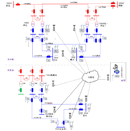 雄安新區110kV蔣莊、110kV臨河、110kV奧威變電站和35kV鄚州、35kV古州、35kV劇村、35kV王莊變電站以及35kV容東移動站新配置5G差動保護及自愈設備,實現基于5G通信的35kV線路(兩端、三端)差動保護,實現110kV臨河站、蔣莊站和奧威站站域備自投、基于5G通信的35kV劇村站和王莊站區域備自投功能以及高低壓不同等級的變電站之間上下級備自投協同優化功能。同時部署主站端在線監測系統,實現智能故障分析等高級功能。