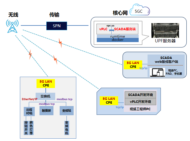 UPF服務(wù)器虛擬化PLC控制:5GUPF服務(wù)器滿足施耐德EAE虛擬化PLC的運行要求,同時滿足與南向設(shè)備的通信需求。