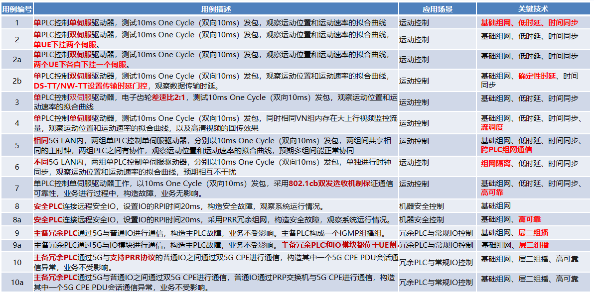 驗證5G確定性技術(shù)的能力,驗證產(chǎn)業(yè)的支持度,驗證5G與工業(yè)協(xié)議的融合度,驗證5G通信能力對工業(yè)自動化應(yīng)用場景(數(shù)據(jù)采集、普通IO、機(jī)器安全控制、運動控制)的覆蓋能力,發(fā)現(xiàn)并解決存在的問題。
