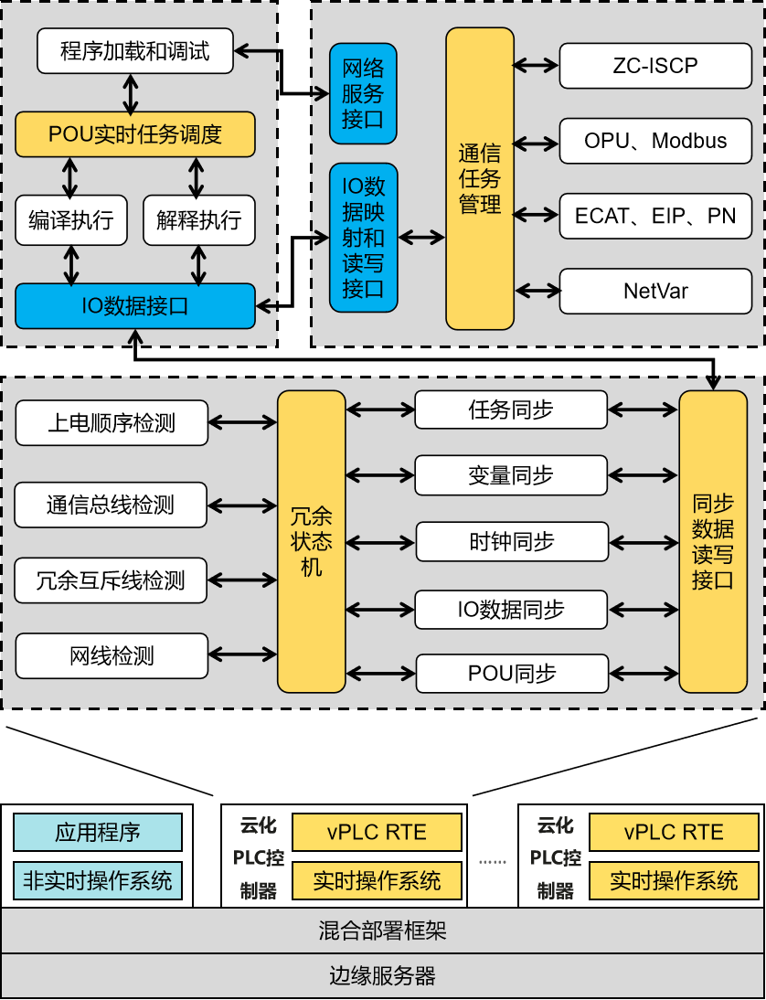 基于混合部署框架,單個或者多個云化PLC控制器部署在同一邊緣服務器,其關鍵技術包括POU實時任務調度、多協議通信管理和熱備冗余。