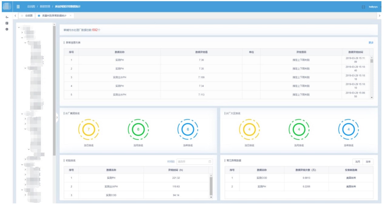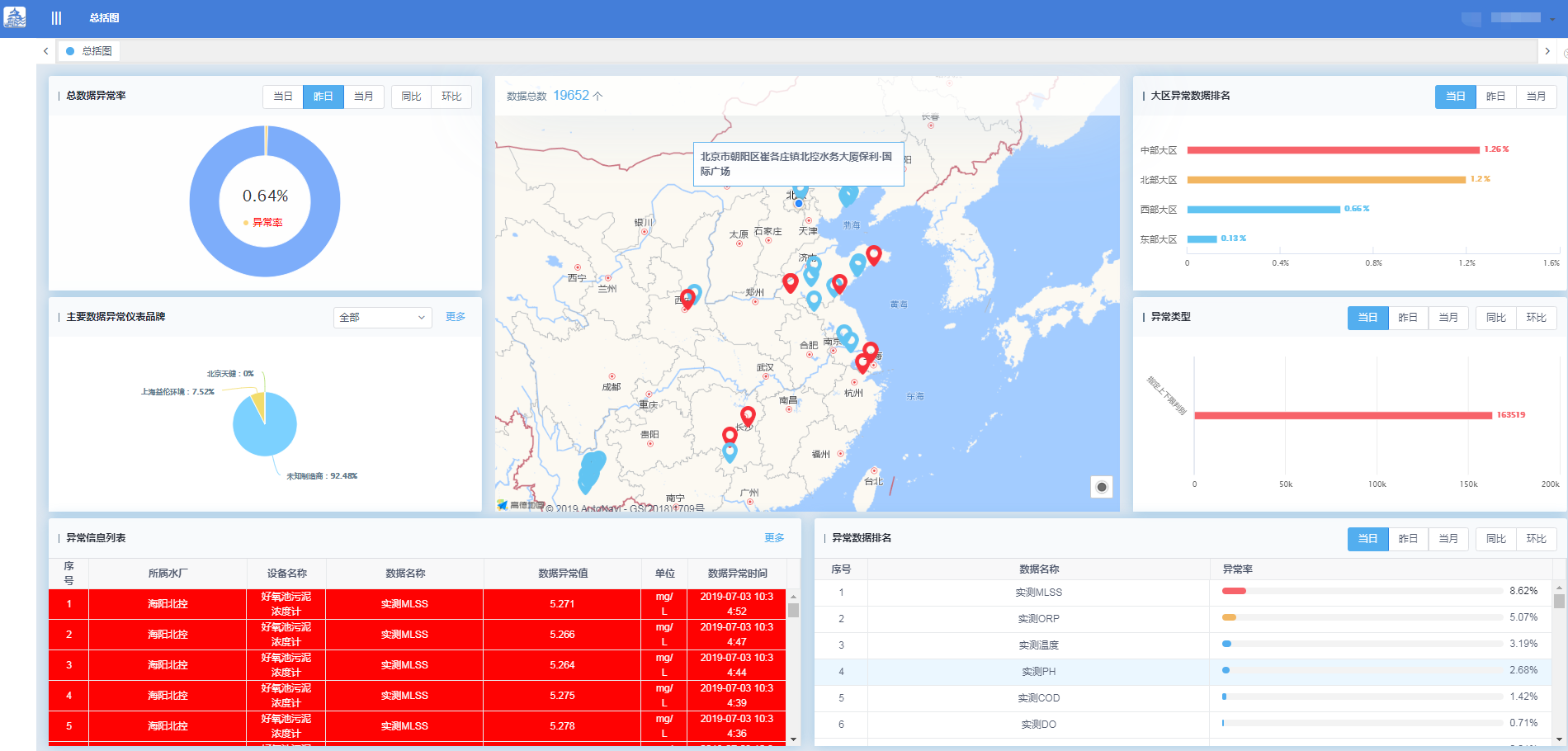判別異常的數(shù)據(jù)通圖形化方式展示,通過對異常數(shù)據(jù)的統(tǒng)計分析,延長設(shè)備和儀表使用壽命,降低設(shè)備維護成本,擇優(yōu)選擇更可靠的品牌產(chǎn)品。在地圖上看到所有污水廠分布以及在線情況,多維度對異常數(shù)據(jù)進行統(tǒng)計,全方位剖析數(shù)據(jù)異常統(tǒng)計情況。