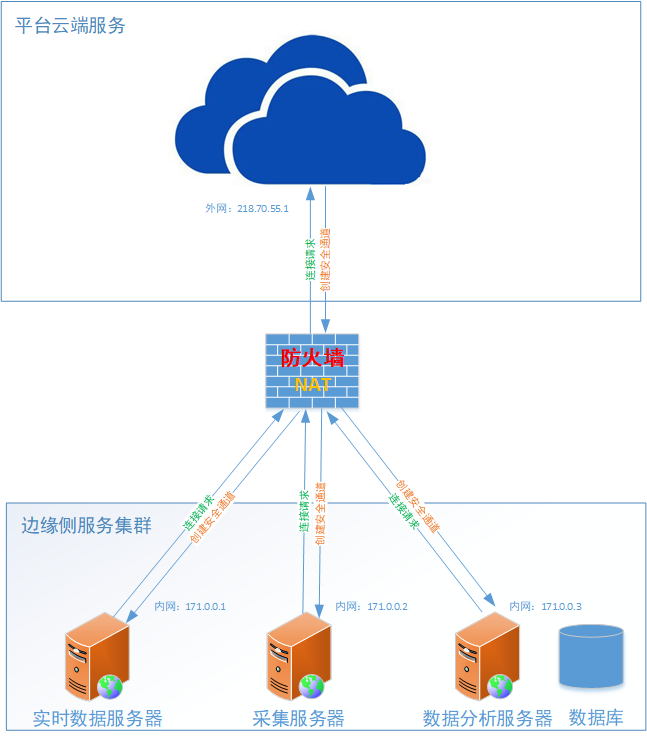 提供NAT或防火墻應(yīng)用場景下邊云互連的解決方案:在互聯(lián)網(wǎng)環(huán)境下,處于NAT或防火墻后端的邊緣側(cè)服務(wù)不能暴露于公網(wǎng)或需與外界做單向的安全隔離,這就要求邊緣側(cè)和云端不能采用常規(guī)的互連機制,平臺使用反向連接技術(shù),由邊緣側(cè)向云端主動發(fā)起連接請求,然后服務(wù)端在此通道基礎(chǔ)上構(gòu)建安全連接,從而跨越防火墻或NAT連接障礙,同時又不降低連接的安全性。