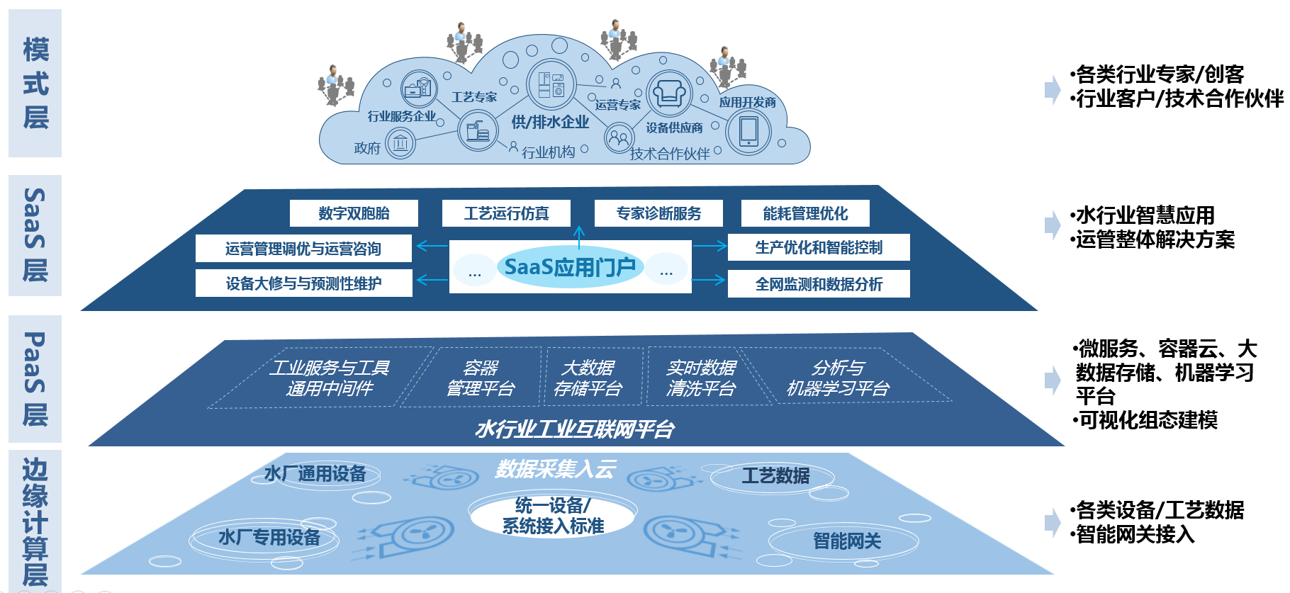 智慧水務(wù)運營管理平臺在技術(shù)創(chuàng)新上采用了融合邊緣計算和云計算的基礎(chǔ)架構(gòu),包括設(shè)備層、PaaS層和SaaS層和模式層。
