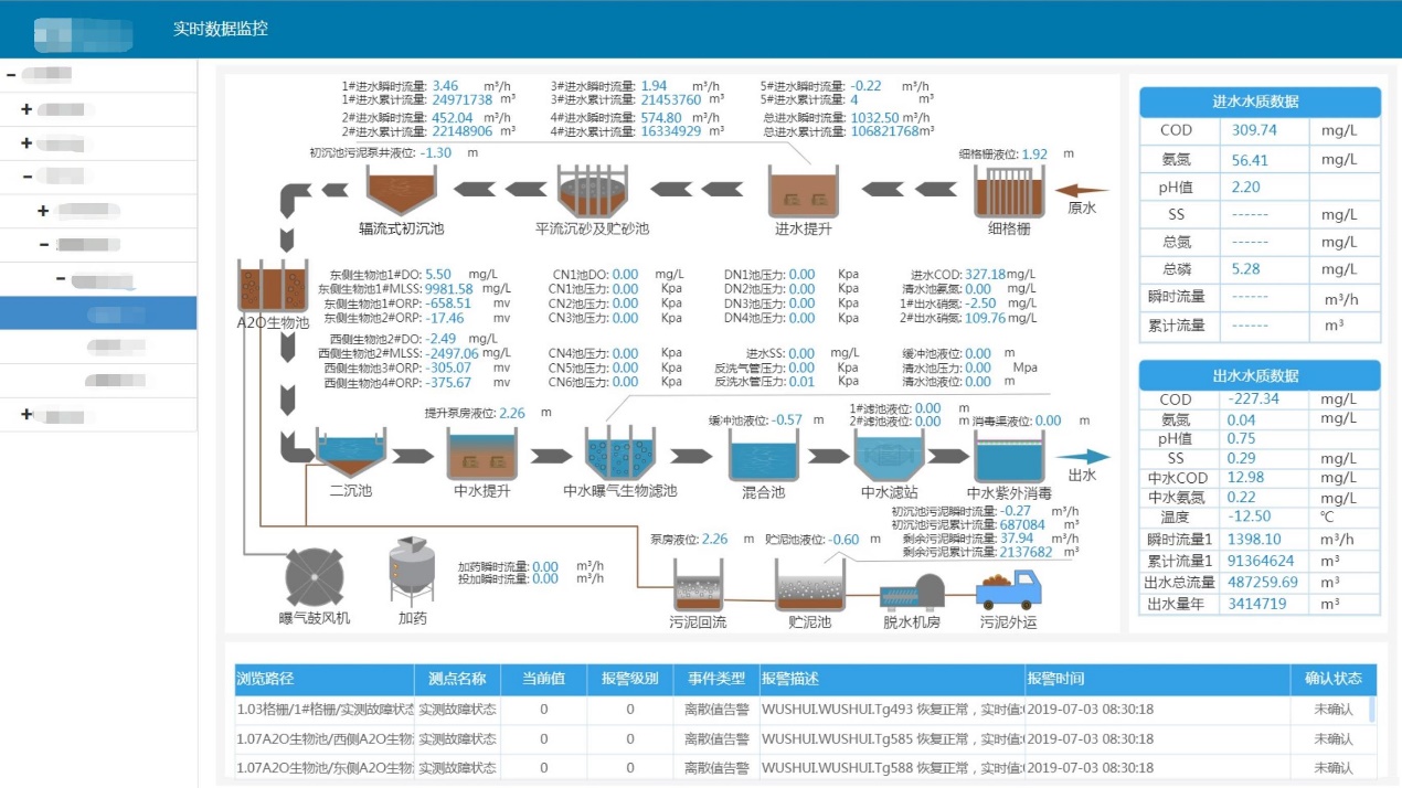 對污水處理廠不同種工藝段圖形化展示,可以實時展示每種工藝段中設(shè)備實時狀態(tài)和儀表實時數(shù)據(jù)。提高數(shù)據(jù)反饋時效性,將實時數(shù)據(jù)最新的變化情況及時展示,當(dāng)現(xiàn)場出現(xiàn)設(shè)備或儀表的告警時,可實時獲取這些告警信息,在第一時間展示給現(xiàn)場操作人員。