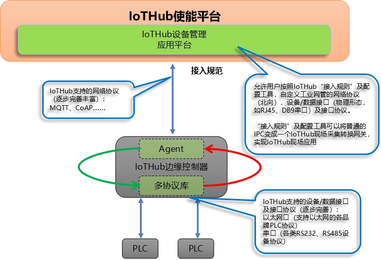 IoTHub邊緣控制器是IT和OT之間的物理接口,實(shí)現(xiàn)工業(yè)互聯(lián)網(wǎng)應(yīng)用的南向與北向“互聯(lián)互通”。IoTHub邊緣控制器產(chǎn)品(圖3)包括IoTHub Agent邊緣采集網(wǎng)關(guān)、工控機(jī)等。結(jié)合不同的采集、處理及存儲(chǔ)需求,邊緣控制涵蓋ARM架構(gòu)、X86架構(gòu)的處理器,支持Linux及Windows操作系統(tǒng),結(jié)合工業(yè)現(xiàn)場(chǎng)典型的數(shù)據(jù)接口類型,典型的南向物理接口包括RJ45(LAN)、RS232、RS485、GPIO等接口,支持主流的PLC協(xié)議及數(shù)控協(xié)議,用于連接邊緣層設(shè)備。北向提供RJ45(WAN)、4G、WiFi等網(wǎng)絡(luò)接口,支持標(biāo)準(zhǔn)TCP/IP、MQTT等網(wǎng)絡(luò)協(xié)議,用于連接工業(yè)互聯(lián)網(wǎng)平臺(tái)或工業(yè)互聯(lián)網(wǎng)賦能平臺(tái)(圖4),完成IT與OT的物理融合。