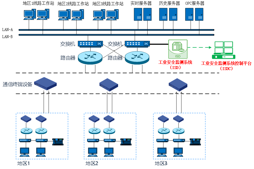 通過(guò)前期調(diào)研了解到,各廠站端的工業(yè)流量匯聚到分控中心。為能夠?qū)崟r(shí)采集流量、不影響現(xiàn)有工業(yè)網(wǎng)絡(luò),采取了在交換機(jī)旁路部署工業(yè)安全監(jiān)測(cè)系統(tǒng)(ISD)進(jìn)行安全監(jiān)測(cè),在分控中心采用工業(yè)安全監(jiān)測(cè)控制平臺(tái)(ISDC)進(jìn)行整體態(tài)勢(shì)感知的解決方案。