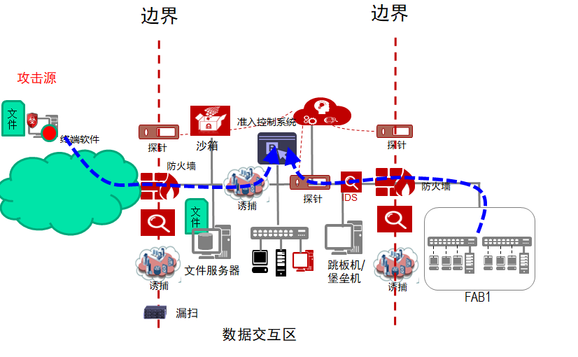 該項目的主動安全防御方案均采用華為的安全產(chǎn)品進行部署,關(guān)鍵組件之間的關(guān)系如圖2所示:
