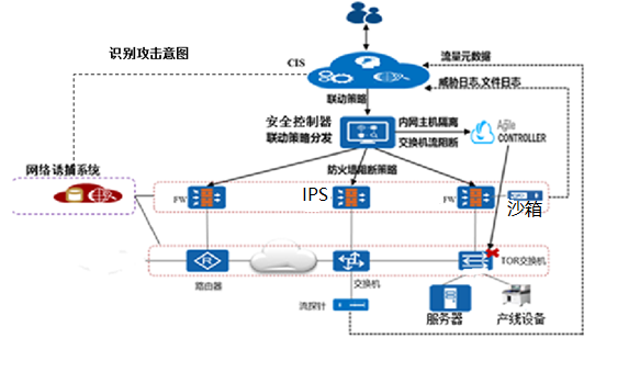 1.對原有的防火墻和IPS進行升級,在保留原有的安全防護能力基礎(chǔ)上,使其能支持與安全分析器、安全控制器和沙箱等進行聯(lián)動,成為安全執(zhí)行器。