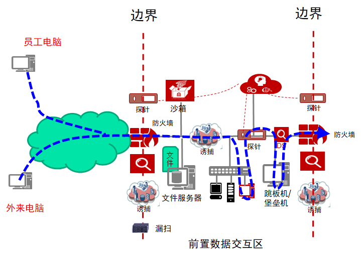 2、所有子網(wǎng)的邊界處部署流量探針,防火墻、IPS、路由器和交換機部署日志探針。