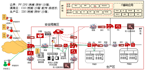 該電子制造基地的安全實施,以保證業(yè)務(wù)連續(xù)性為目標(biāo),采取管理約束和技術(shù)保證雙管齊下的策略,根據(jù)生產(chǎn)實際述求,本著先改造IT后增強OT的安全實施理念,提出了被動的靜態(tài)防御和主動防御相結(jié)合的安全部署方式, 通過嚴(yán)格的安全隔離和訪問控制機制等傳統(tǒng)的靜態(tài)防御手段,為生產(chǎn)基地構(gòu)建獨立的網(wǎng)絡(luò)安全防護圍墻;在此基礎(chǔ)上,引入主動防御的安全工具,通過先進的安全防御工具,來彌補攻防的不對稱問題,提高應(yīng)對未知威脅的反應(yīng)能力和預(yù)警能力,確保工控系統(tǒng)運行環(huán)境的安全性。