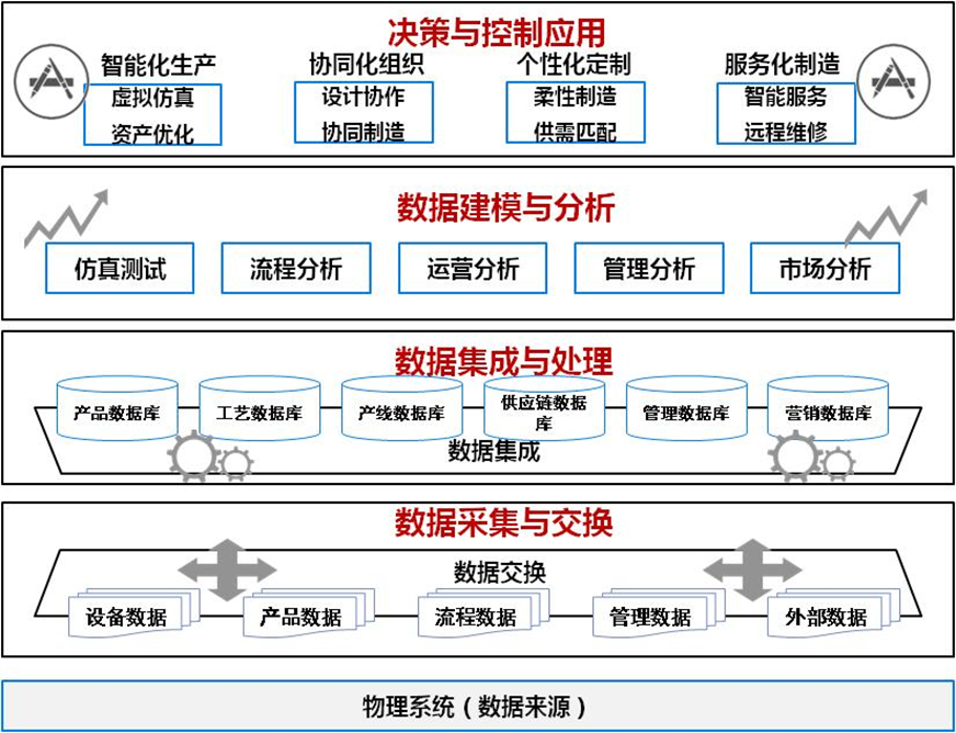 工業(yè)互聯(lián)網(wǎng)的數(shù)據(jù)體系,主要有數(shù)據(jù)采集與交換、數(shù)據(jù)集成與處理、數(shù)據(jù)建模與分析和數(shù)據(jù)驅(qū)動(dòng)下的決策與控制應(yīng)用四個(gè)層次組成。