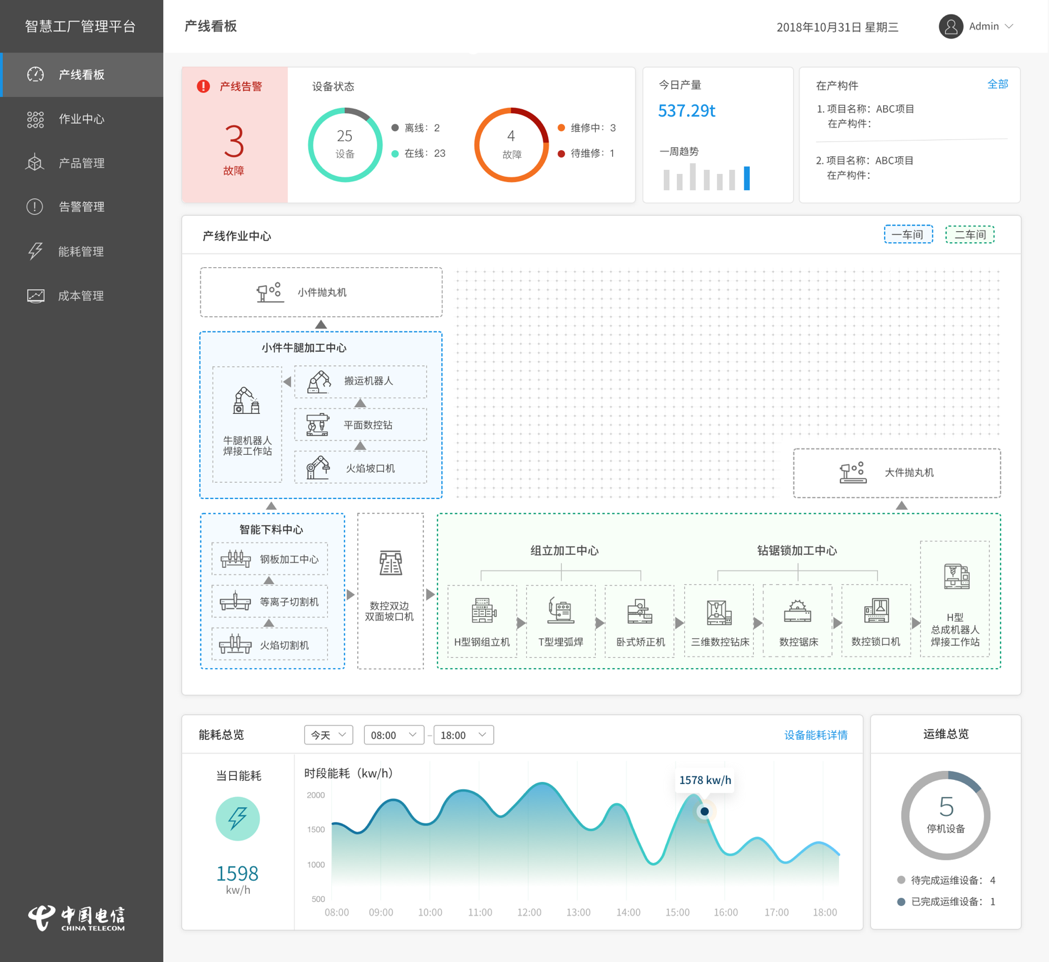 生產(chǎn)線狀態(tài)可視化展示,將整個(gè)產(chǎn)線級(jí)的生產(chǎn)狀態(tài)作總體呈現(xiàn),其中包含產(chǎn)線設(shè)備加工過程模擬、設(shè)備告警信息的高亮顯示、當(dāng)日產(chǎn)量與訂單信息和能耗總覽。總體看板也是其他分支功能模塊的總?cè)肟冢梢酝ㄟ^點(diǎn)擊各信息進(jìn)行不同維度的下鉆。主要內(nèi)容包含: