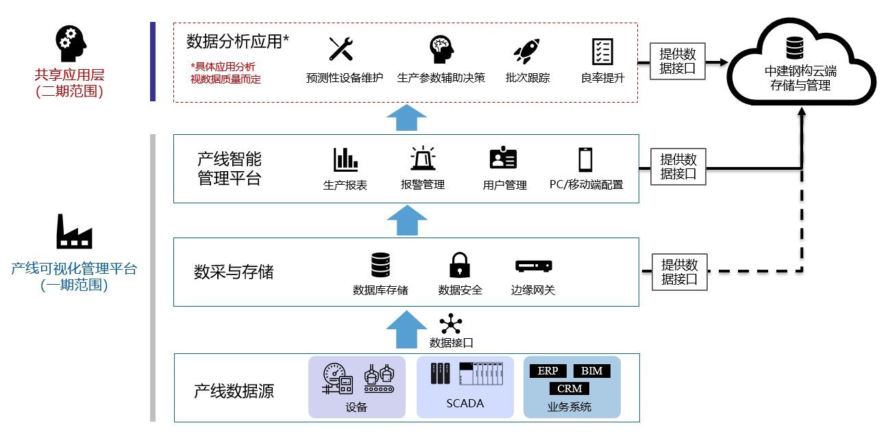 項(xiàng)目整體實(shí)施計(jì)劃分為兩步:一期產(chǎn)線可視化管理平臺(tái)搭建、二期共享應(yīng)用層開發(fā)。