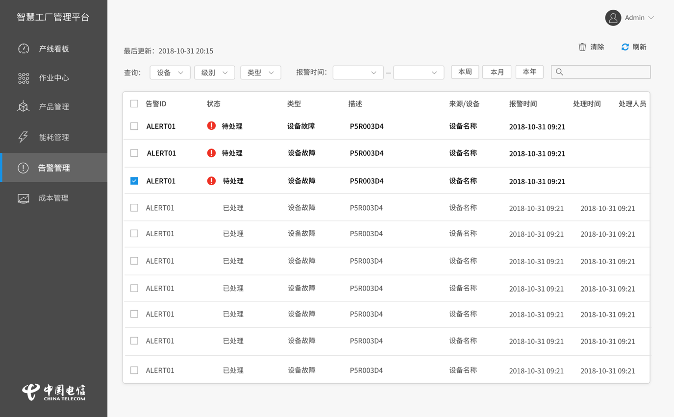 告警功能信息展示,將提供設(shè)備異常告警信息的高亮顯示,通過顯示告警詳情故障代碼,提示相應(yīng)操作員和運(yùn)維人員進(jìn)行及時(shí)處理和維保服務(wù),并在處理報(bào)警信息時(shí)記錄處理時(shí)間供后續(xù)進(jìn)行歷史信息檢索。對(duì)歷史告警信息的檢索頁可以通過設(shè)備、時(shí)間等多個(gè)維度進(jìn)行。主要內(nèi)容包含: