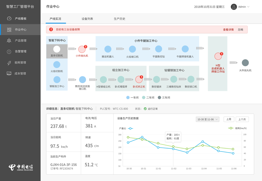 作業(yè)中心信息展示,是整體可視化平臺(tái)以設(shè)備管理為維度的功能下鉆。作業(yè)中心模塊分為產(chǎn)線實(shí)況、設(shè)備列表和生產(chǎn)歷史三大展示功能。產(chǎn)線實(shí)況可以查看產(chǎn)線總體的生產(chǎn)情況,并可以下鉆到加工中心或設(shè)備維度查看實(shí)時(shí)產(chǎn)量、生產(chǎn)參數(shù)和能耗情況。主要內(nèi)容包含: