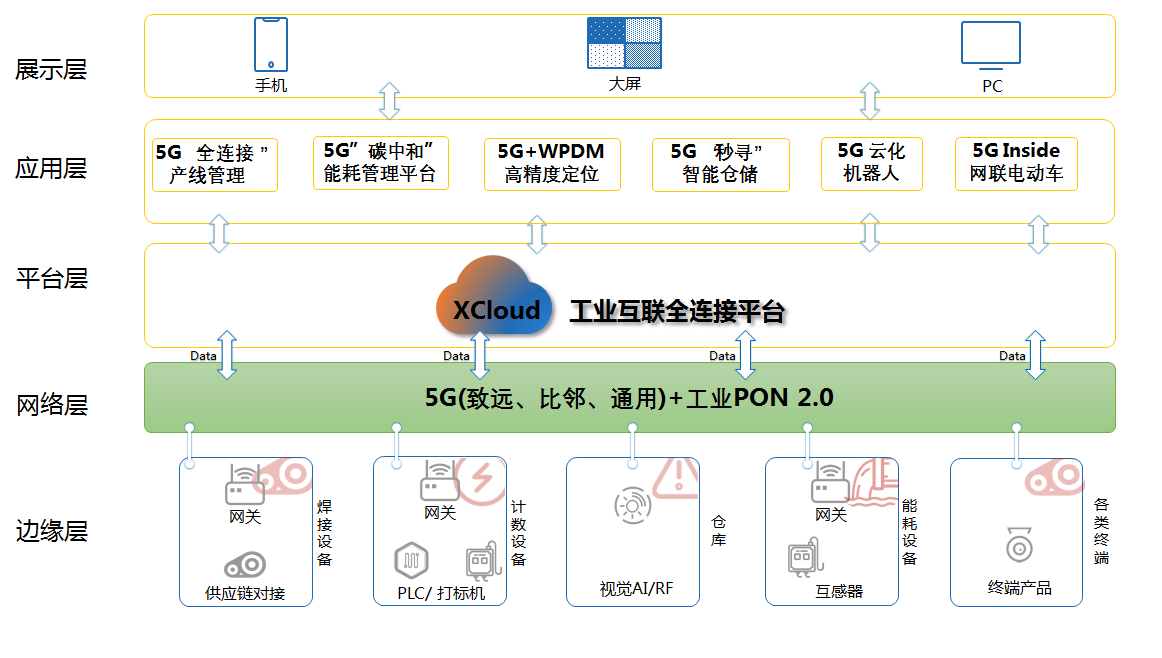 通訊層用于邊緣層硬件設施的數(shù)據(jù)傳輸及上云,包括有線以太網(wǎng)、無線WIFI、無線4G/5G等多種常用通訊方式,以通訊可靠、傳輸穩(wěn)定、經(jīng)濟環(huán)保為原則,根據(jù)現(xiàn)場實際傳輸條件為硬件設施選擇最合適的通訊方式,本方案采用電信5G網(wǎng)絡和工業(yè)PON(光網(wǎng)絡)相結(jié)合的方式。