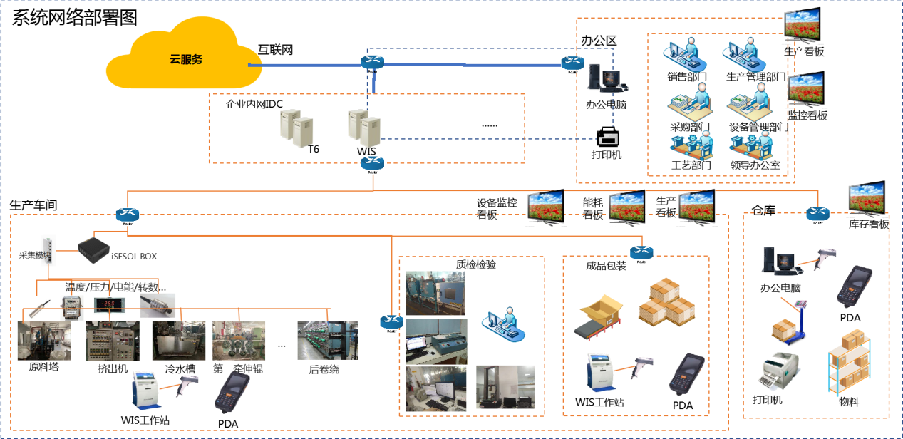 項(xiàng)目針對(duì)客戶在生產(chǎn)管控、質(zhì)量追溯、能耗優(yōu)化、倉(cāng)儲(chǔ)管理等方面的需求,提出了基于iSESOL工業(yè)互聯(lián)網(wǎng)平臺(tái)的工廠數(shù)字化制造運(yùn)營(yíng)解決方案。方案通過(guò)數(shù)據(jù)、軟件、網(wǎng)絡(luò)等信息技術(shù)與人員、機(jī)器、物料、環(huán)境、供應(yīng)鏈等制造要素的深度融合,開(kāi)展以網(wǎng)絡(luò)協(xié)同、精益生產(chǎn)、精細(xì)管理和智能決策為代表的現(xiàn)代生產(chǎn)制造與運(yùn)營(yíng)管理能力建設(shè)。通過(guò)搭建現(xiàn)場(chǎng)級(jí)工業(yè)網(wǎng)絡(luò),部署相關(guān)軟硬件產(chǎn)品,定制化開(kāi)發(fā)相關(guān)模塊,為企業(yè)提供包括裝備聯(lián)網(wǎng)、數(shù)據(jù)采集、車間可視化、智能化倉(cāng)儲(chǔ)等在內(nèi)的數(shù)字化賦能業(yè)務(wù),幫助企業(yè)實(shí)現(xiàn)提質(zhì)降本增效。