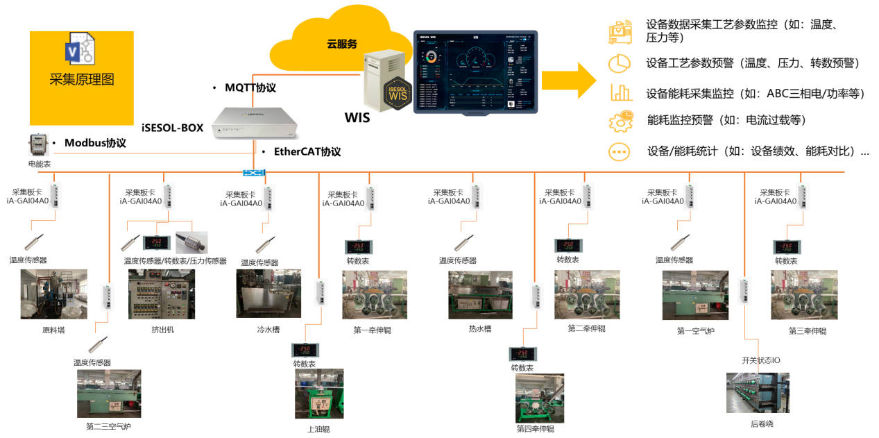 (2)將生產(chǎn)設(shè)備聯(lián)網(wǎng),設(shè)備運(yùn)行數(shù)據(jù)采集及相關(guān)工段設(shè)備的能耗數(shù)據(jù)采集,解決設(shè)備運(yùn)行數(shù)據(jù)孤島問(wèn)題,實(shí)時(shí)掌握設(shè)備運(yùn)行工藝參數(shù)、對(duì)工藝參數(shù)進(jìn)行監(jiān)控預(yù)警,保證產(chǎn)品生產(chǎn)質(zhì)量,實(shí)時(shí)掌握設(shè)備能耗情況及全廠各部門的能耗情況、對(duì)全廠各部門能耗進(jìn)行監(jiān)控管理及統(tǒng)計(jì)分析。