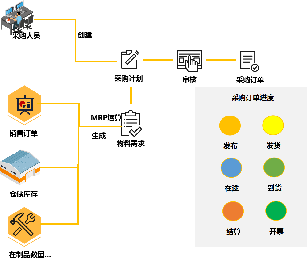 通過(guò)WIS系統(tǒng)提供的采購(gòu)管理功能,根據(jù)銷售訂單、產(chǎn)品配方、銷售訂單、物料庫(kù)存等相關(guān)數(shù)據(jù),系統(tǒng)能夠自動(dòng)進(jìn)行物料齊套檢查,自動(dòng)生成物料需求計(jì)劃,采購(gòu)人員可根據(jù)物料需求計(jì)劃,創(chuàng)建采購(gòu)計(jì)劃。同時(shí)支持采購(gòu)計(jì)劃的審核,物料采購(gòu)進(jìn)度狀態(tài)(發(fā)布、發(fā)貨、在途、到貨、結(jié)算、開(kāi)票)的更新。各部門可通過(guò)系統(tǒng),實(shí)時(shí)掌握物料采購(gòu)進(jìn)度,及時(shí)應(yīng)對(duì)生產(chǎn)物料需求情況。