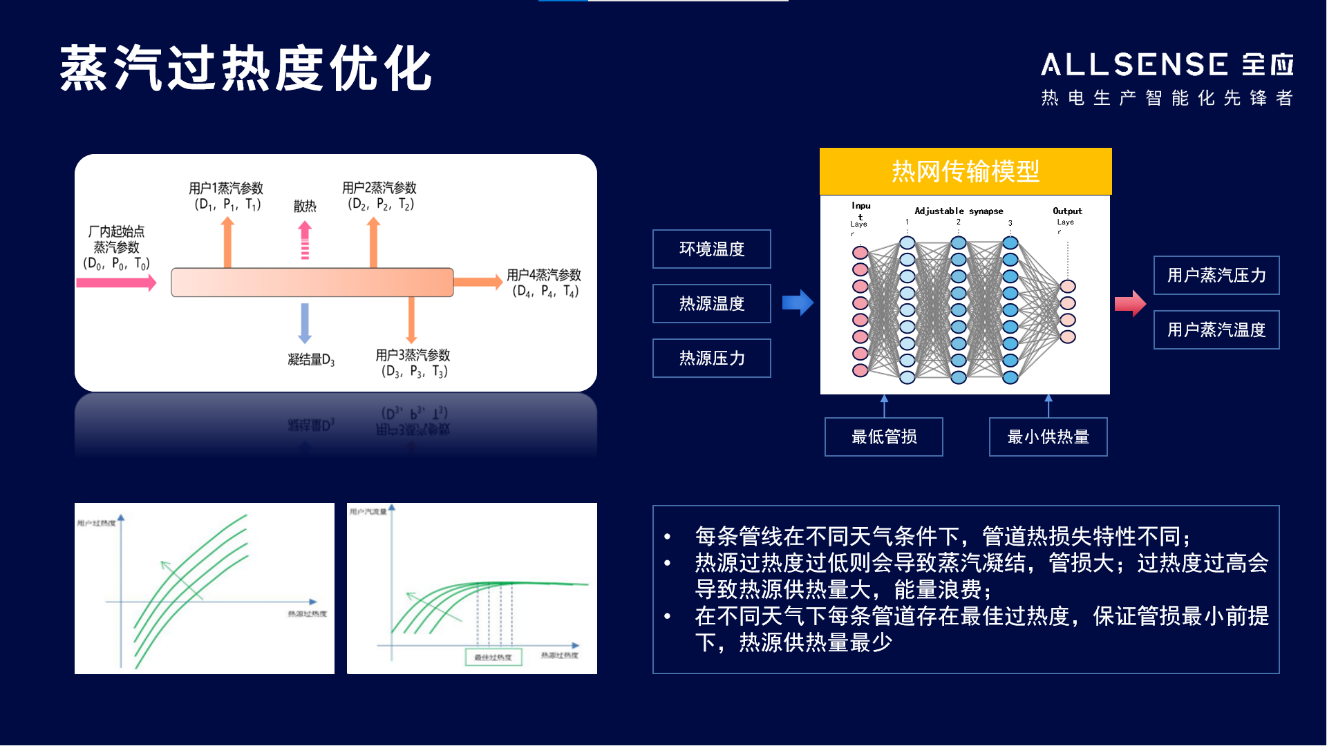 全應熱電云對整個供熱管網進行整體建模后,主要設計管道的壓降模型和供熱延遲模型,結合實際用戶端的實時流量數據,預測下一個供熱時延周期,供熱管線入口處的熱負荷,協調鍋爐和汽機負荷。實際效果,可以降低供熱管線入口蒸汽溫度至265℃~272℃,即滿足消費端使用,又能提高整個熱電系統的能效水平。