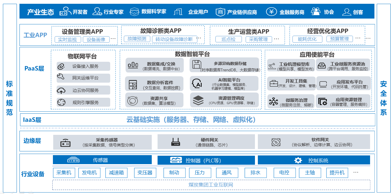 以焦煤集團工業互聯網平臺為基礎,構建煤炭行業工業互聯網應用生態,整合設備行業制造商、設備管理專家、第三方檢修機構、第三方設備維修商、行業協會、政府等全社會資源,布局互聯網+設備生態圈,業務覆蓋經營管理、生產管控一體化、數據采集與存儲、設備故障預測與診斷、能耗優化、健康評估、運行優化、供應鏈管理等,形成全產業鏈的大生態系統。提升資源配置和專業技術服務能力,實現價值提升,為企業帶來更可觀的經濟效益同時為設備資產行業探索出更多新的商業模式。