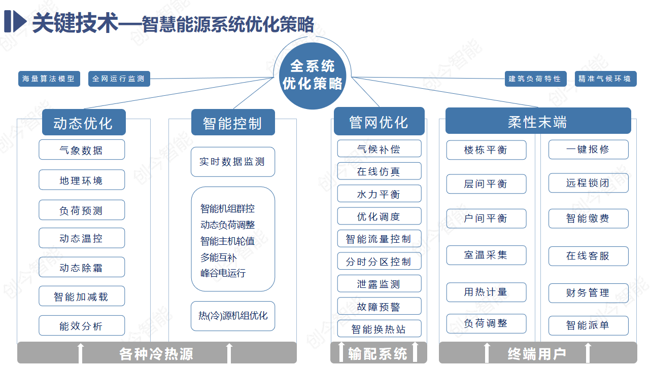 過網(wǎng)絡(luò)與創(chuàng)今現(xiàn)場(chǎng)智能控制系統(tǒng)精準(zhǔn)操控,實(shí)現(xiàn)“源、網(wǎng)、荷、儲(chǔ)、用”全系統(tǒng)動(dòng)態(tài)化、精細(xì)化調(diào)整,最終達(dá)到全網(wǎng)平衡,保持能源站長(zhǎng)期最高效運(yùn)行,實(shí)現(xiàn)能源站“按需供熱”,高效節(jié)能減排。