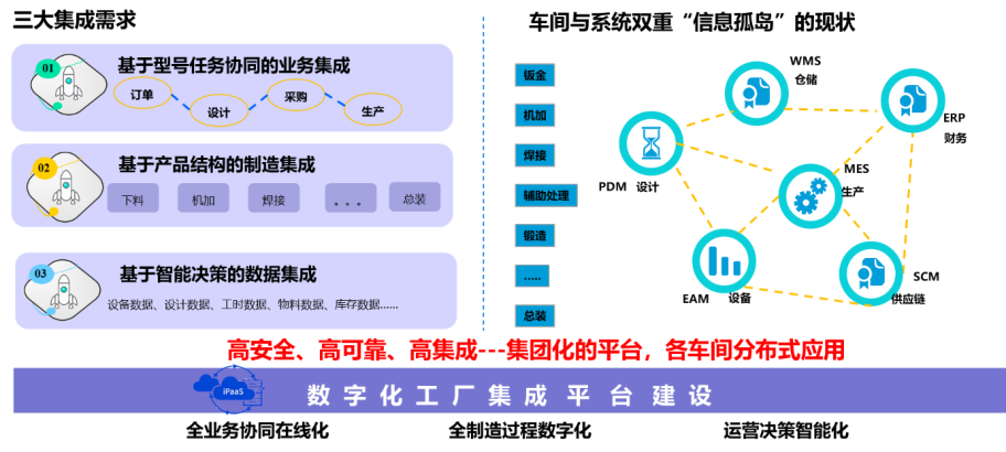 因為航天裝備制造行業的特殊性,同時還具有高安全、高可靠、高集成的要求;但是,現狀卻面臨著車間與系統的“雙重信息孤島”;集成平臺建設需求與“雙重信息孤島”是系統建設要解決的根本問題。