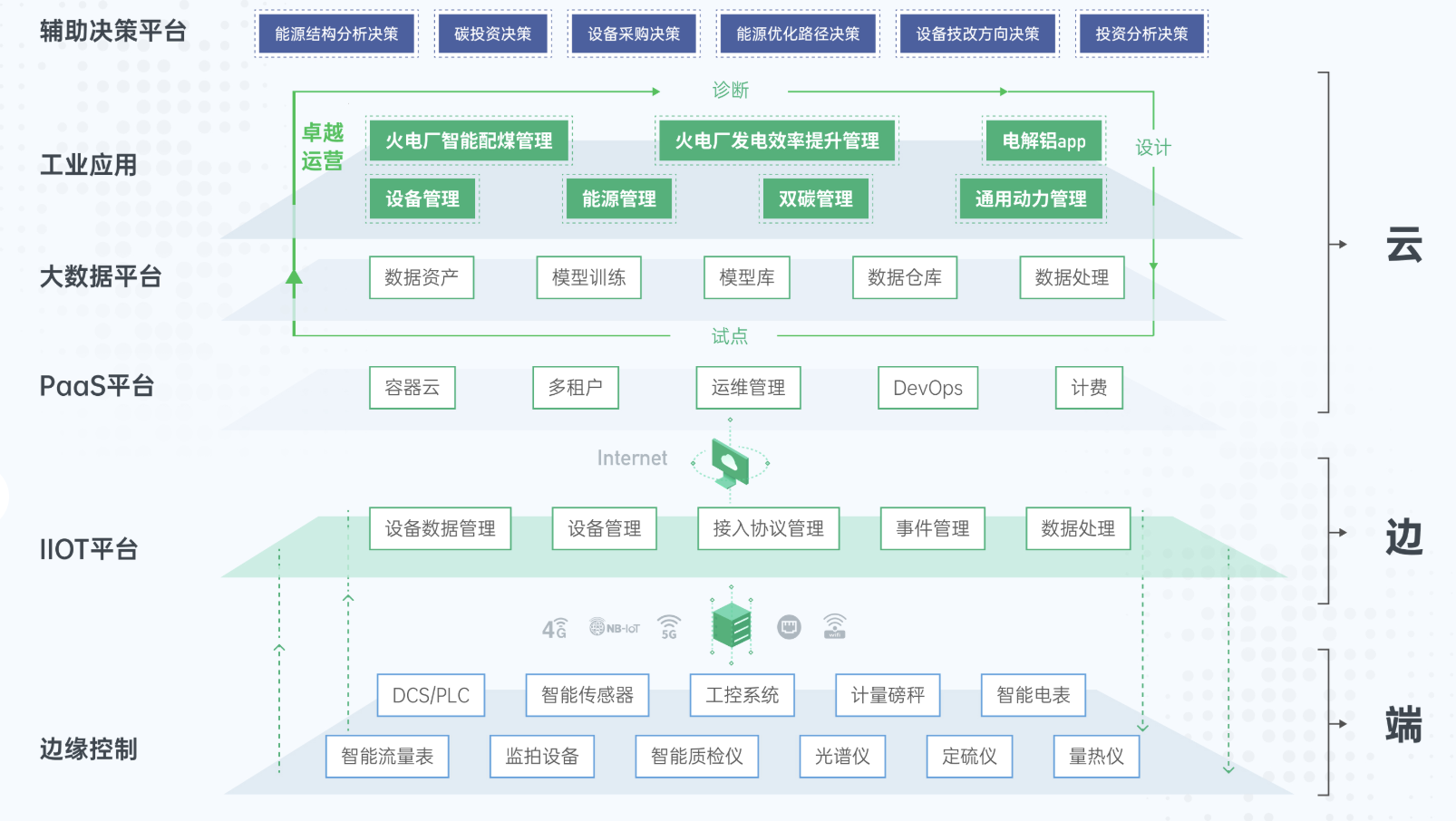 政府工作報告將“做好碳達峰、碳中和工作”列為2021年重點任務之一,并作為推動傳統產業綠色發展、促進經濟轉型升級的重要路徑。廣域銘島致力于利用數字化手段幫助百礦集團節能減碳,針對集團電解鋁能耗過高、自備火電廠煤耗過高等痛點問題,構建百礦集團工業互聯網平臺,打破產業鏈上數據孤島,沉淀工藝知識,構建火力發電和電解過程的機理模型,實現智能決策優化路徑,達到綠色集約生產,應對能源危機和“雙限”挑戰。