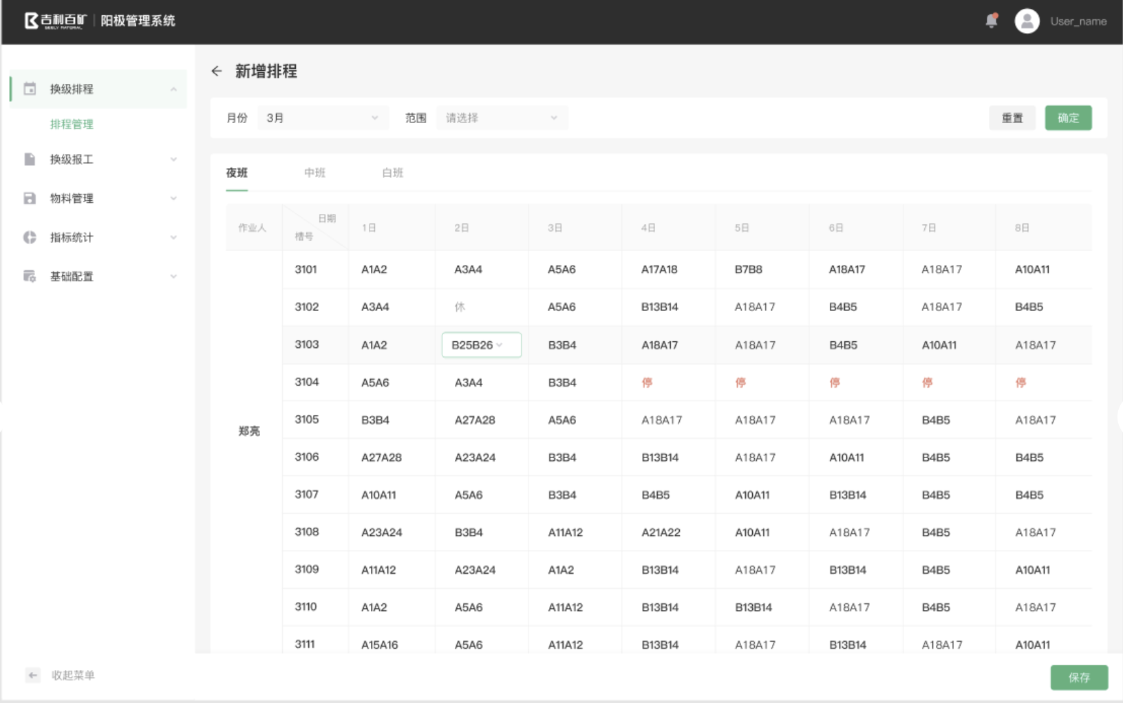 陽極管理:包含換極排程、換極過程管理、換極監控、問題管理、物料管理、指標統計六部分。通過陽極消耗大數據分析模型、陽極二維碼追溯、換極過程標準化管控等方法及工具以及電解槽運行數據,建立陽極消耗曲線與各變量之間的關系模型,預測每一個陽極消耗的速度和使用到期的時間,實現物耗成本及能耗成本的節約。