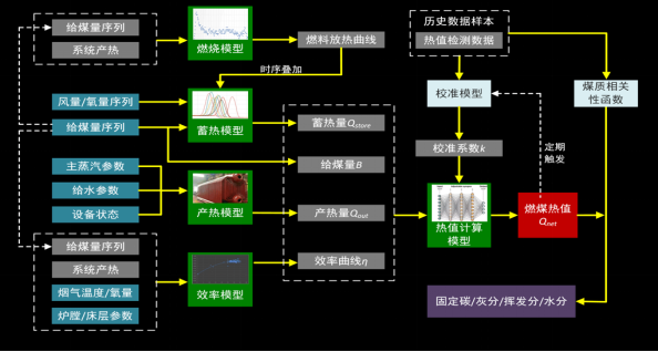 燃煤作為熱電廠最主要的原料,是影響熱電廠控制的關(guān)鍵。燃煤作為天然礦物其成份是不均勻的,而且大多數(shù)熱電廠都需要將多種來源的燃煤進(jìn)行摻配使用,所以實(shí)時(shí)入爐的燃煤品質(zhì)是波動(dòng)的。目前還沒有有效的技術(shù)對(duì)燃煤成份進(jìn)行在線實(shí)時(shí)檢測(cè),所以燃煤成份都是通過抽樣離線化驗(yàn)獲得的。當(dāng)煤質(zhì)發(fā)生較大變化時(shí),缺乏煤質(zhì)的及時(shí)感知會(huì)導(dǎo)致控制不穩(wěn)定的問題。如下是一套煤質(zhì)軟測(cè)量的原理圖: