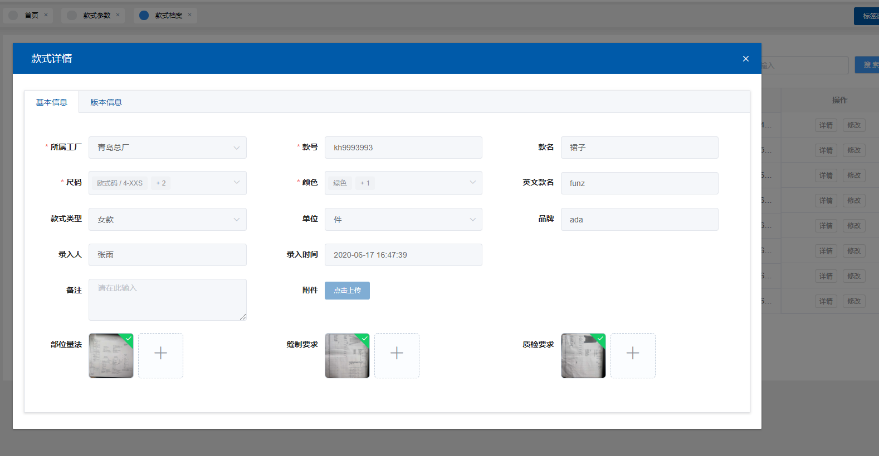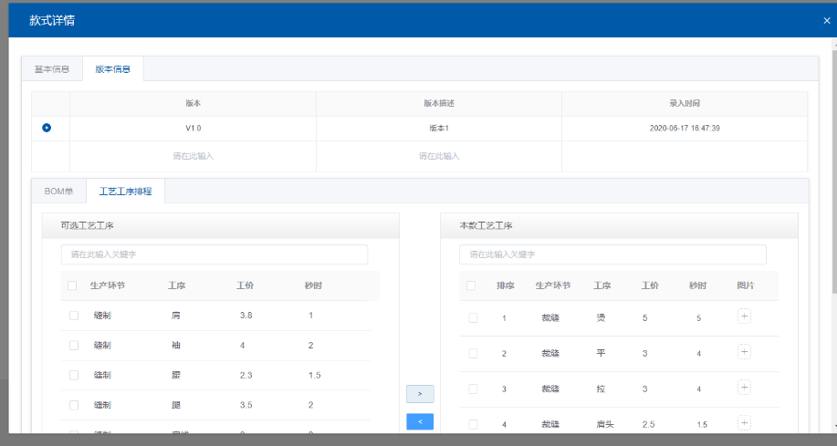 為服裝生產企業建立款式檔案,并對其進行版本劃分、物料BOM整合以及工藝工序排程,使其與工人做工工序一一對應。