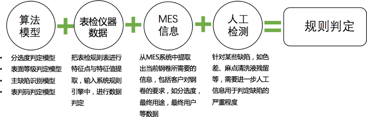 首先,表檢儀將非結(jié)構(gòu)化數(shù)據(jù)(圖片信息)結(jié)構(gòu)化,將幾千種產(chǎn)品外觀缺陷歸納為 60-70 大類,例如:平整斑、翹皮、擦傷、壓印、麻點、氣泡等。 其次,表檢數(shù)據(jù)結(jié)合 MES 數(shù)據(jù)輸入到模型中進(jìn)行訓(xùn)練,通過聚類算法、規(guī)則引擎(含用戶需求識別的自學(xué)習(xí)重構(gòu)功能)、缺陷嚴(yán)重程度量化模型等深度學(xué)習(xí)技術(shù),對軋鋼分級最初步判定。最后,再結(jié)合人工的進(jìn)一步確認(rèn)得出最終判定結(jié)果。