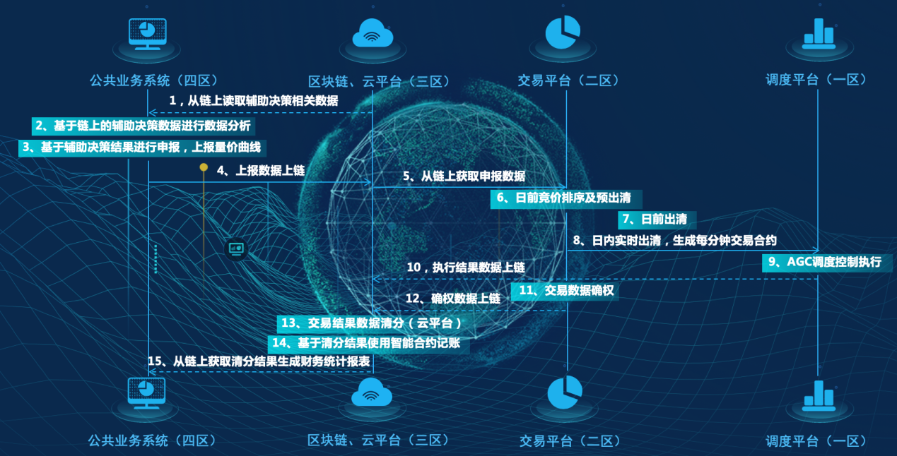 我們將區(qū)塊鏈技術(shù)引入新能源輔助服務(wù)交易,搭建了以省電力調(diào)控中心為盟主的共享儲(chǔ)能調(diào)峰市場(chǎng)交易聯(lián)盟鏈,著力解決儲(chǔ)能調(diào)峰交易結(jié)果數(shù)據(jù)存證、智能合約清分結(jié)算和財(cái)務(wù)通證記賬以及電費(fèi)資產(chǎn)證券化的問(wèn)題,提升市場(chǎng)交易的公信力。