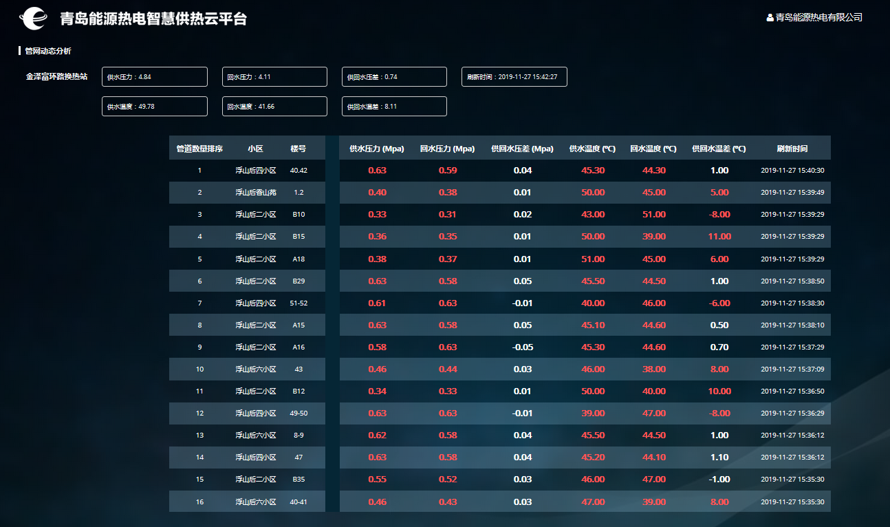 熱源、管網、換熱站、熱用戶的相關運行參數采集比較完善,但在數據的深層次分析、系統化運用、入戶供熱調節方面較欠缺,在一定程度上,造成了“數據資源”的浪費,同時,也為“數據分析節能”留存了空間。