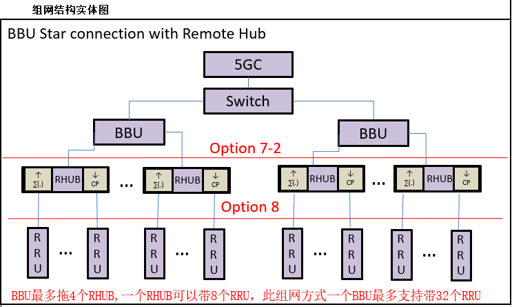 系統組網連接如上圖所示。RHUB使用光電復合纜連接遠端單元RRU,RRU含內置天線實現5G信號覆蓋。