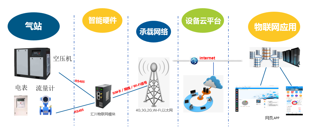 本方案的核心是一套端到端,即空壓機設備供氣端/用氣端等數據采集終端端到應用端(包括手機端/Web端)的智能物聯網系統,再通過相關工業云的云端存儲、大數據統計分析、數據可視化等技術實現具體業務功能。