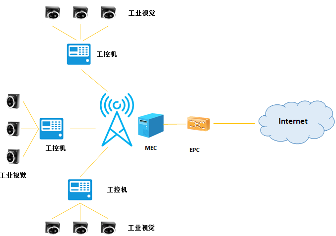 本方案為兩級星型拓撲結構(如下圖所示),第一級為工業視覺設備和工控機之間的星型組網,第二級為工控機和蜂窩基站間的星型組網。首先,多個工業視覺設備和一個工控機通過工業總線形成星型組網,完成工業產品圖像數據的傳輸和工業殘次品的剔除控制;其次,工控機和蜂窩基站形成星型組網,完成基于模型的圖像實時決策判斷和數據的傳輸。