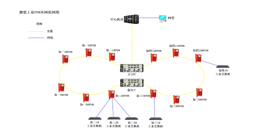 工業PON網絡的拓撲結構可與各車間信息節點無縫結合,可根據需要組成多鏈路備份的樹形結構、環形結構等傳送網絡。網絡拓撲圖如下所示: