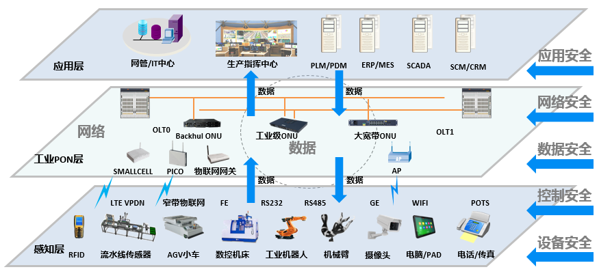 工業PON可以實現現場設備與上層實體(如服務器、SCADA系統等)的連接,支持數據采集、生產指令下達、傳感數據采集、廠區視頻監控等功能。工業PON網絡是各種信息集成的基礎通道,是智能制造縱向集成的基礎,基于PON技術的工業網絡平臺將產品設計研發、制造生產、銷售、物流、售后各工業化環節融合集成,最終實現企業CRM、MES、ERP、SCM、SCADA等系統信息的統一控制和管理。