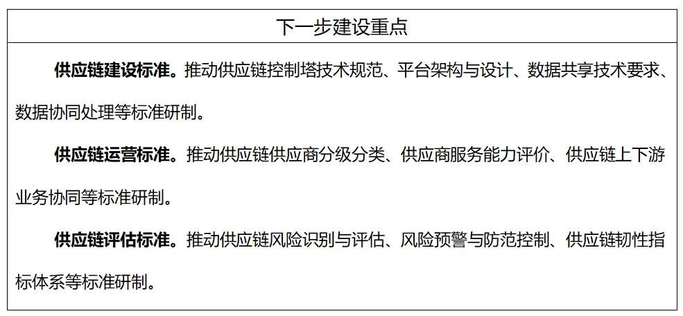 主要包括供應鏈風險識別與評估、風險預警與防范控制等風險評估標準;供應鏈韌性指標體系、測試與評估方法等性能評估標準。