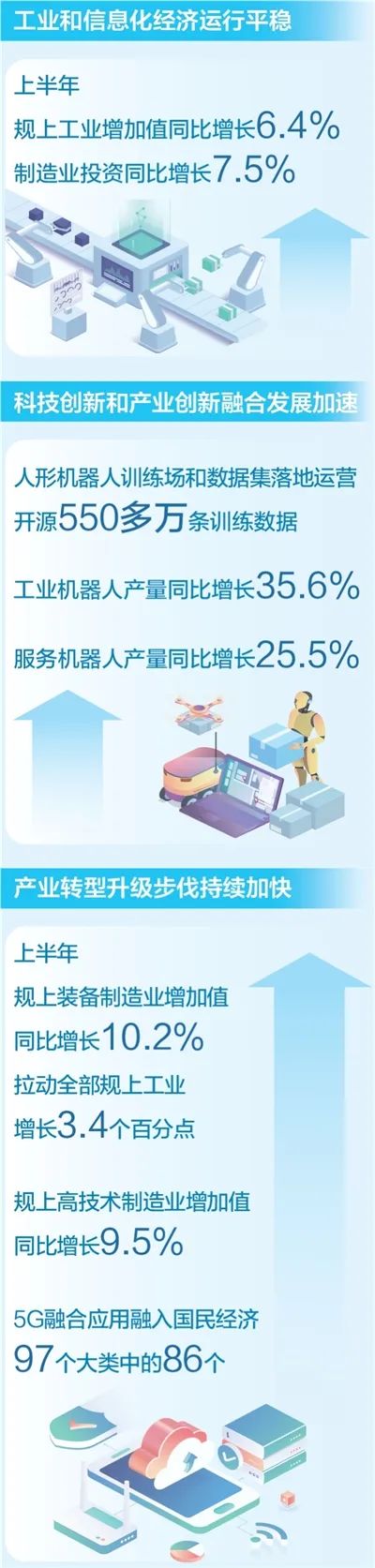 規(guī)模以上工業(yè)增加值一季度和二季度同比分別增長6.5%和6.3%;規(guī)模以上高技術(shù)制造業(yè)增加值同比增長9.5%,對全部規(guī)模以上工業(yè)增長的貢獻(xiàn)率為23.3%;實(shí)施制造業(yè)大規(guī)模設(shè)備更新和技術(shù)改造升級工程,制造業(yè)投資同比增長7.5%……7月18日,國務(wù)院新聞辦舉行新聞發(fā)布會,工業(yè)和信息化部總工程師謝少鋒等介紹了上半年工業(yè)經(jīng)濟(jì)運(yùn)行情況。