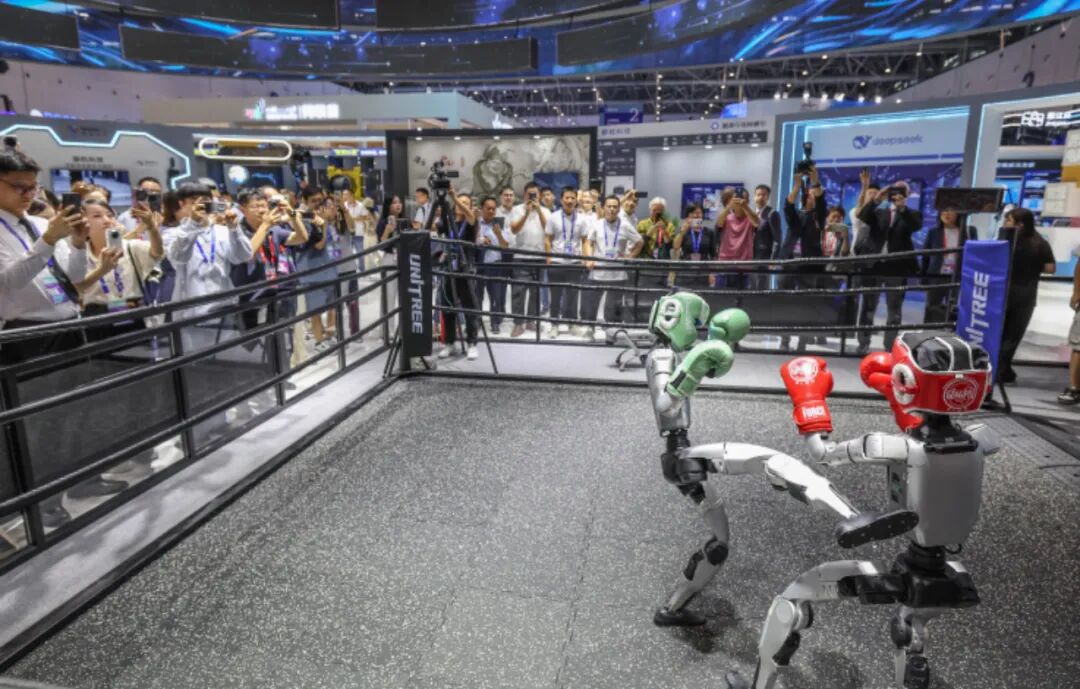 在第四屆全球數(shù)字貿(mào)易博覽會數(shù)智未來主題展區(qū)的杭州六小龍專區(qū),宇樹科技的人形機器人在進行格斗擂臺賽。新華社記者 徐昱攝