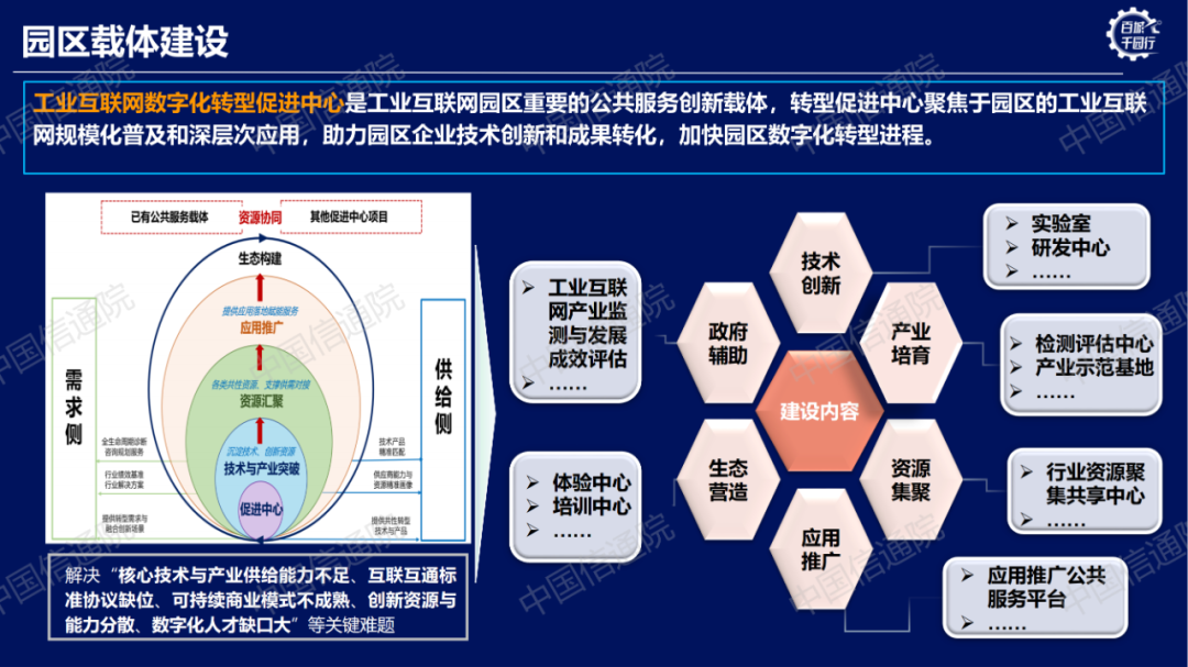 工業互聯網園區整體框架:工業互聯網園區的建設與發展,應在國家和各級地方政府政策措施的引領下,以科學規劃為指導,通過打造網絡、標識、平臺、安全等園區數字底座,構建園區內部與外部的數據流動閉環,形成各產業角色之間的協同有機生態。建設數字化轉型促進中心等載體,以標準、評價、金融等體系為保障,通過新技術、新模式、新場景、新業態的應用,形成園區的健康、低碳、良性、區域一體化發展的新發展模式,建立園區發展特色和發展優勢。
