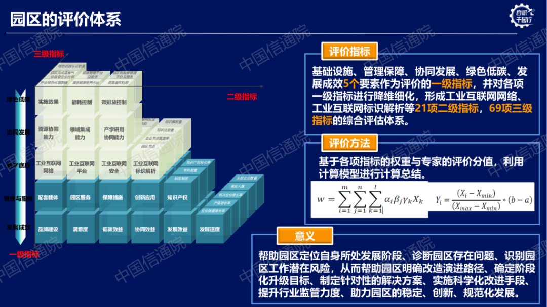 中國信通院總工程師敖立對指南(2.0版本)進行了詳細解讀。他指出指南(2.0版本)整體包括發展背景、內涵框架、建設內容、實施路徑和評價指標五個部分。圍繞數字經濟、綠色低碳、中小企業特色產業集群等最新相關政策,更新了工業互聯網園區的最新發展背景、內涵與框架,細化了標識、數據等園區建設內容,增加了線上線下一體化的園區新運營模式總結,并相應的對評價指標體系進行了優化調整。同時,結合工業互聯網園區近幾年的發展態勢,節選部分優秀案例,以饗讀者。