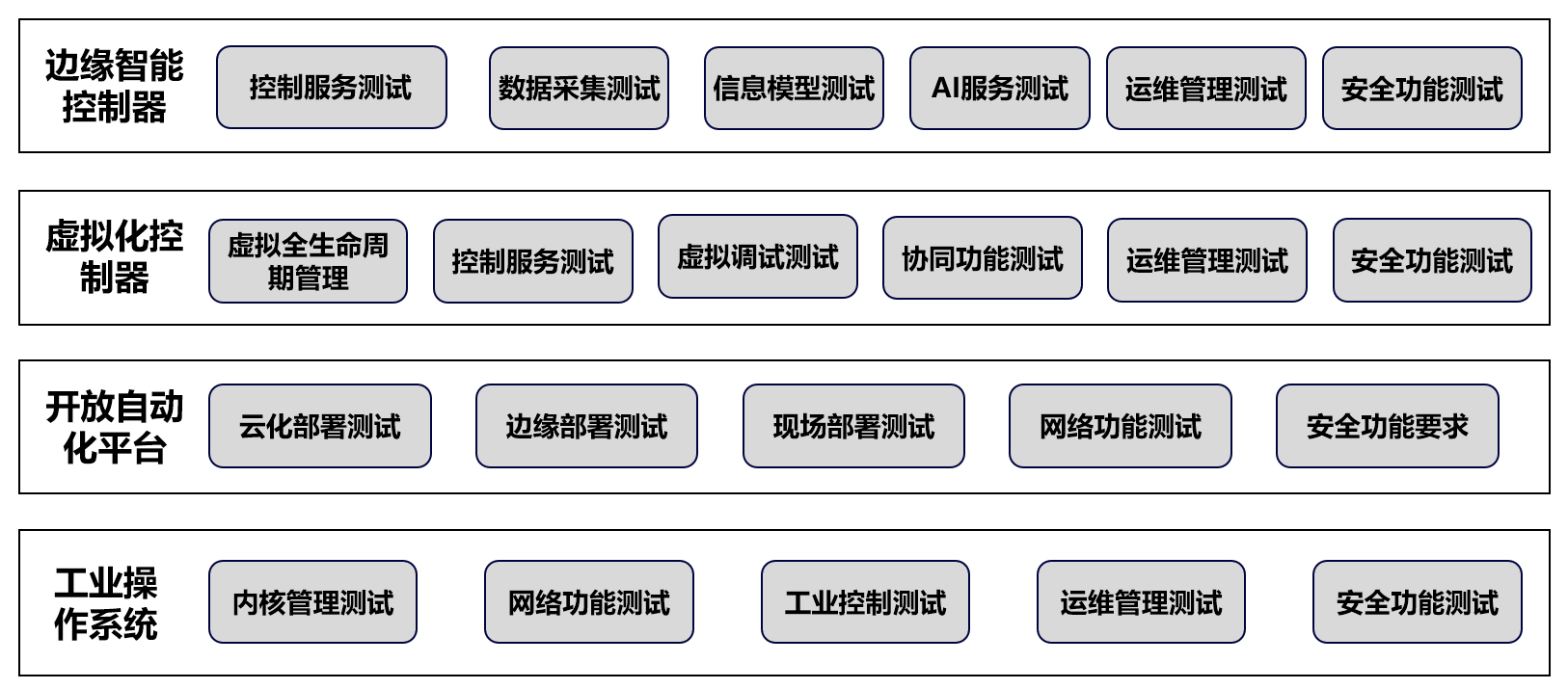 新型工業(yè)控制產(chǎn)品測試對象包括邊緣智能控制器、虛擬化控制器、開放自動化平臺、工業(yè)操作系統(tǒng)、智能數(shù)采與監(jiān)視系統(tǒng)等。