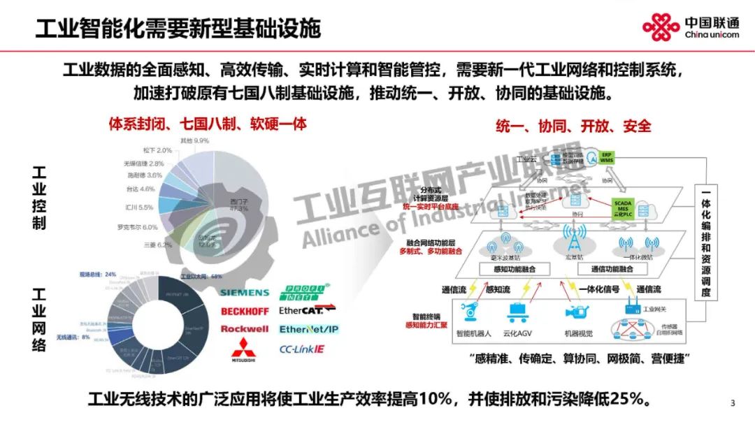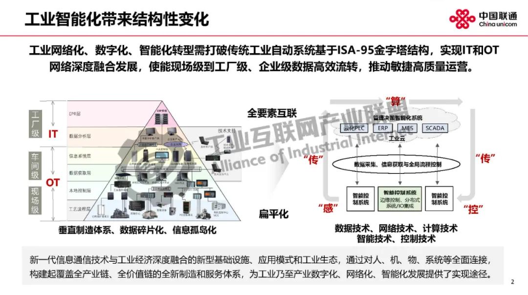 黃蓉介紹,工業(yè)網(wǎng)絡(luò)化、數(shù)字化、智能化轉(zhuǎn)型需打破傳統(tǒng)工業(yè)自動(dòng)系統(tǒng)基于ISA-95金字塔結(jié)構(gòu),實(shí)現(xiàn)IT和OT網(wǎng)絡(luò)深度融合發(fā)展,使能現(xiàn)場(chǎng)級(jí)到工廠級(jí)、企業(yè)級(jí)數(shù)據(jù)高效流轉(zhuǎn),推動(dòng)敏捷高質(zhì)量運(yùn)營(yíng)。工業(yè)數(shù)據(jù)的全面感知、高效傳輸、實(shí)時(shí)計(jì)算和智能管控,需要新一代工業(yè)網(wǎng)絡(luò)和控制系統(tǒng),加速打破原有七國(guó)八制基礎(chǔ)設(shè)施,推動(dòng)統(tǒng)一、開(kāi)放、協(xié)同的基礎(chǔ)設(shè)施。打造新型工業(yè)網(wǎng)絡(luò),一方面應(yīng)持續(xù)夯實(shí)5G+工業(yè)互聯(lián)網(wǎng)等規(guī)模化應(yīng)用,另一方面應(yīng)不斷探索工業(yè)智能化深化應(yīng)用下新的生產(chǎn)模式、交互模式,從而明確對(duì)網(wǎng)絡(luò)基礎(chǔ)設(shè)施的新的需求。
