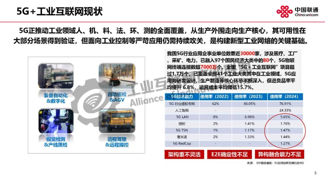 5G正推動(dòng)工業(yè)領(lǐng)域人、機(jī)、料、法、環(huán)、測(cè)的全面覆蓋,從生產(chǎn)外圍走向生產(chǎn)核心,其可用性在大部分場(chǎng)景得到驗(yàn)證,但面向工業(yè)控制等嚴(yán)苛應(yīng)用仍需持續(xù)攻關(guān),是構(gòu)建新型工業(yè)網(wǎng)絡(luò)的關(guān)鍵基礎(chǔ)。