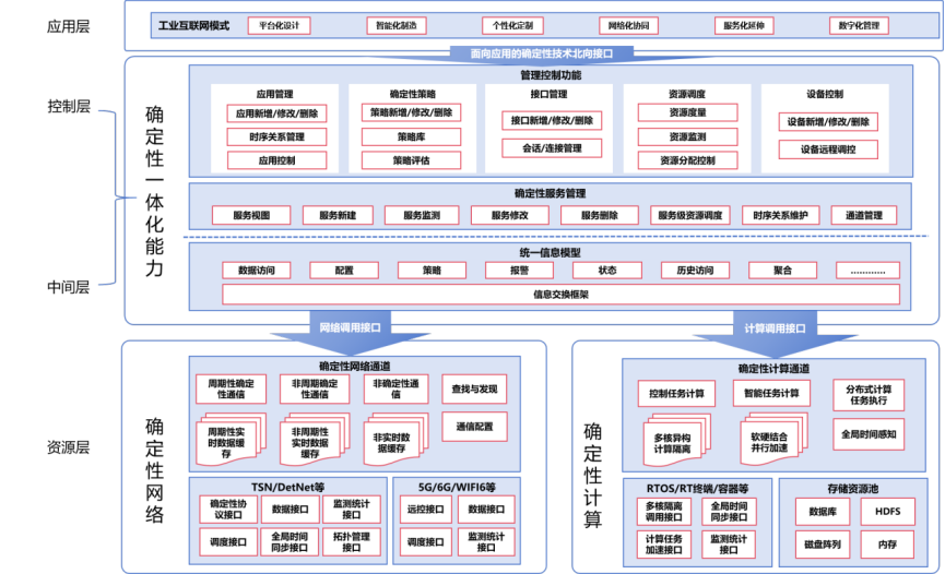 面向應(yīng)用的確定性技術(shù)架構(gòu)如下圖所示,與傳統(tǒng)工業(yè)網(wǎng)絡(luò)架構(gòu)不同的是,通過確定性一體化能力在資源之上的層面統(tǒng)籌確定性網(wǎng)絡(luò)和確定性計算。其中,確定性服務(wù)管理創(chuàng)新性地圍繞工業(yè)生產(chǎn)中應(yīng)用協(xié)同關(guān)系編排算網(wǎng)資源,并保障整個流程的確定性。確定性服務(wù)的指標(biāo)可以落地到確定性網(wǎng)絡(luò)指標(biāo)和確定性計算指標(biāo),從而滿足控網(wǎng)算融合過程中的緊密協(xié)同需求。管理控制功能提供了應(yīng)用、策略、設(shè)備、資源等全局調(diào)度能力,相關(guān)策略對全工廠的確定性服務(wù)進行動態(tài)優(yōu)化,再將配置信息通過統(tǒng)一信息模型、網(wǎng)絡(luò)調(diào)用接口和計算調(diào)用接口下發(fā)到資源層。