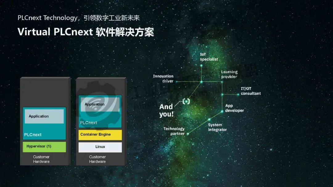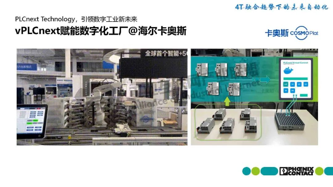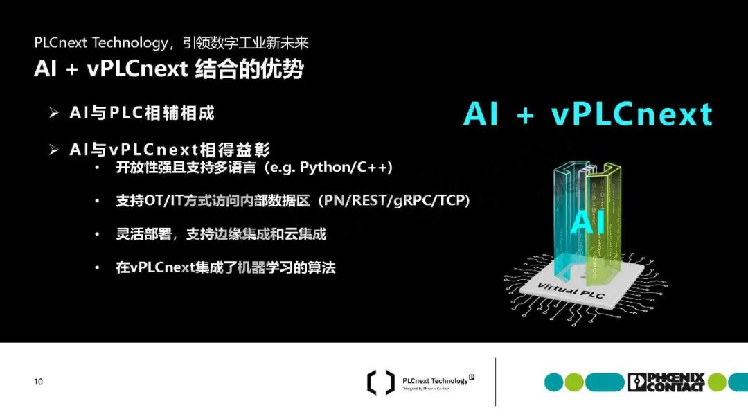 梁恩泉介紹,菲尼克斯電氣推出基于PLCnext技術的SoftPLC解決方案,突破傳統PLC硬件限制,實現虛擬化部署。該方案將PLC運行時環境(SoftPLC Runtime/eCLR)嵌入用戶硬件平臺,支持IEC 61131-3與C/C++等高級語言混合編程,并兼容工業機器人、數控機床等多場景需求。最新發布的PLCnext Virtual Control作為純軟件方案,可在通用硬件上動態創建PLC實例,實現功能靈活擴展和集中維護。該技術通過IT/OT深度融合,集成開源生態,為基礎設施、能源、工廠自動化等領域提供數字化底座,推動工業自動化進入"硬件平臺化、軟件服務化"的新階段。