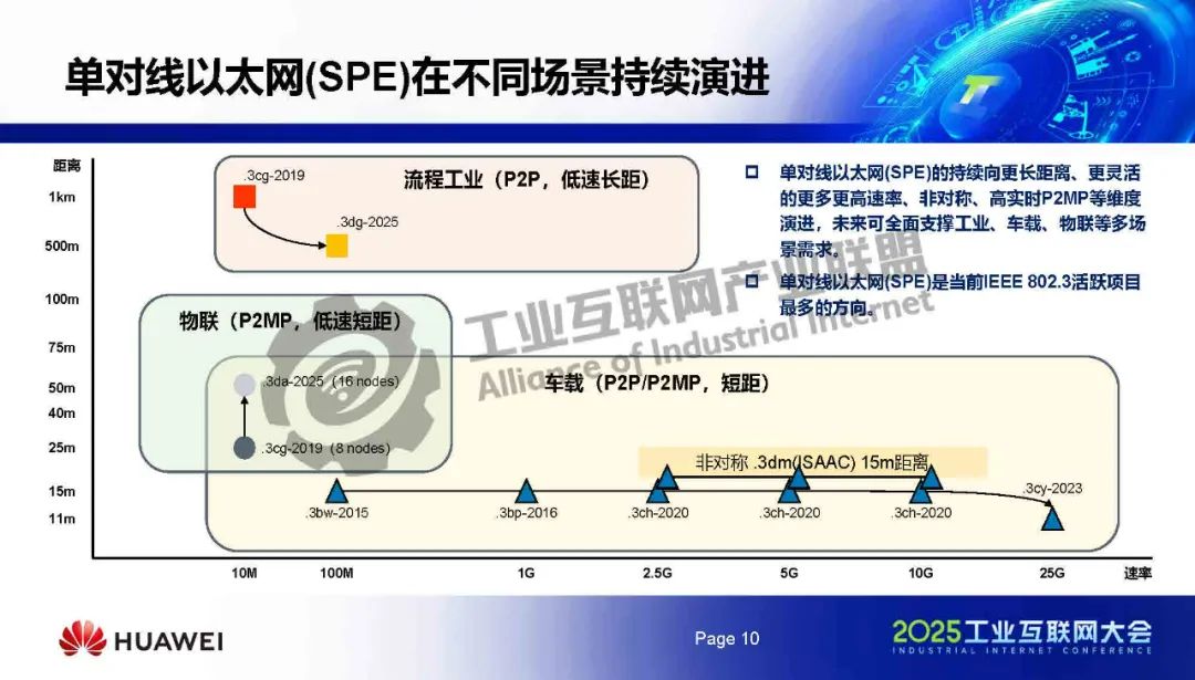 鐘其文介紹,單對(duì)線以太網(wǎng)(SPE)在帶寬距離上存在優(yōu)勢(shì),正逐步替換工業(yè)現(xiàn)場(chǎng)的傳統(tǒng)二線制通信技術(shù)。單對(duì)線以太網(wǎng)(SPE)的持續(xù)向更長(zhǎng)距離、更靈活的更多更高速率、非對(duì)稱、高實(shí)時(shí)P2MP等維度演進(jìn),未來(lái)可全面支撐工業(yè)、車載、物聯(lián)等多場(chǎng)景需求。單對(duì)線以太網(wǎng)(SPE)是當(dāng)前IEEE 802.3活躍項(xiàng)目最多的方向。
